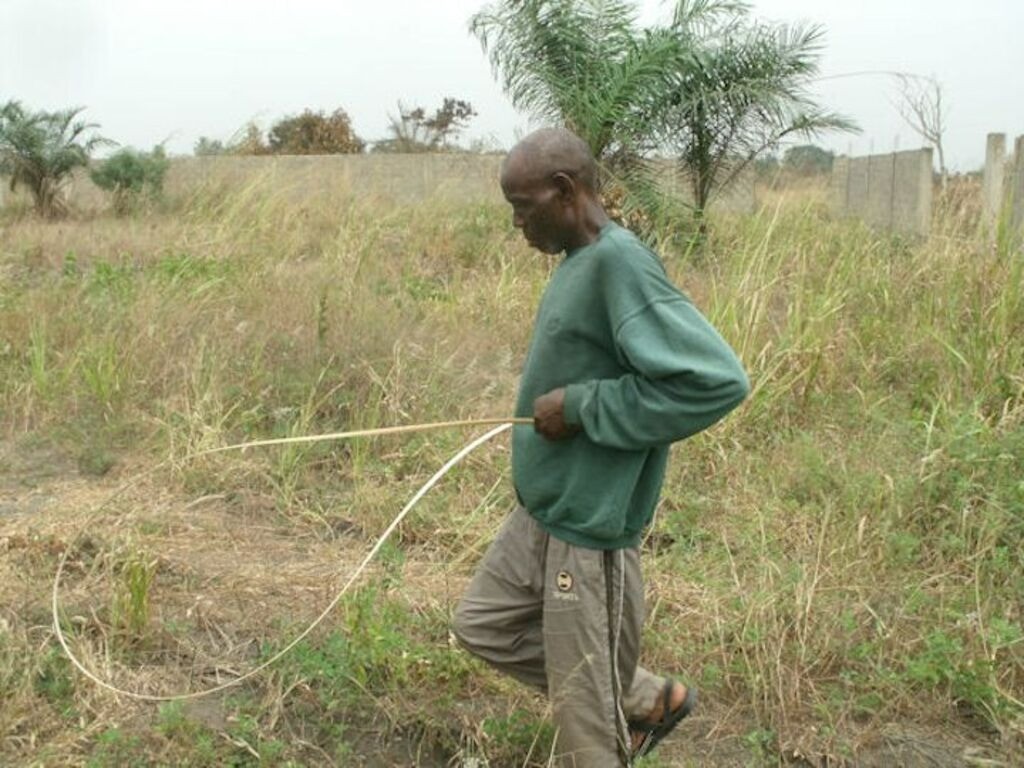 Suche der Wasserader mit Hilfe einer Wünschelrute. Foto: Copyright © Tamatogo e.V.